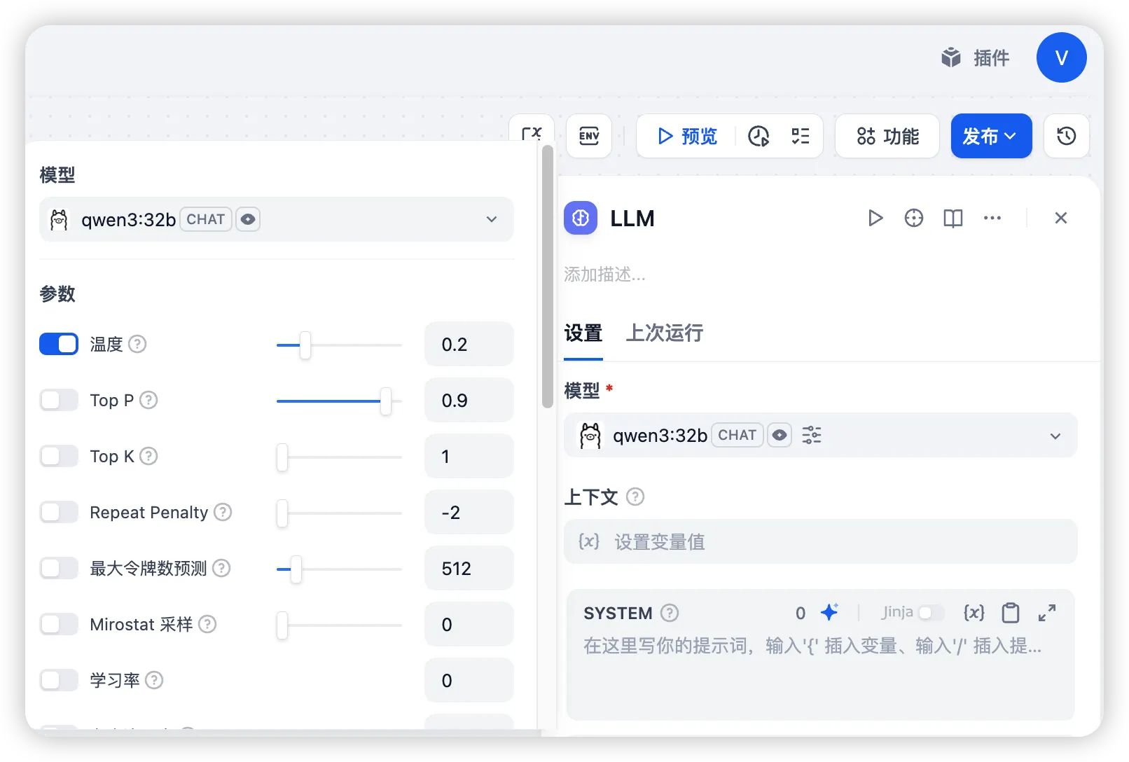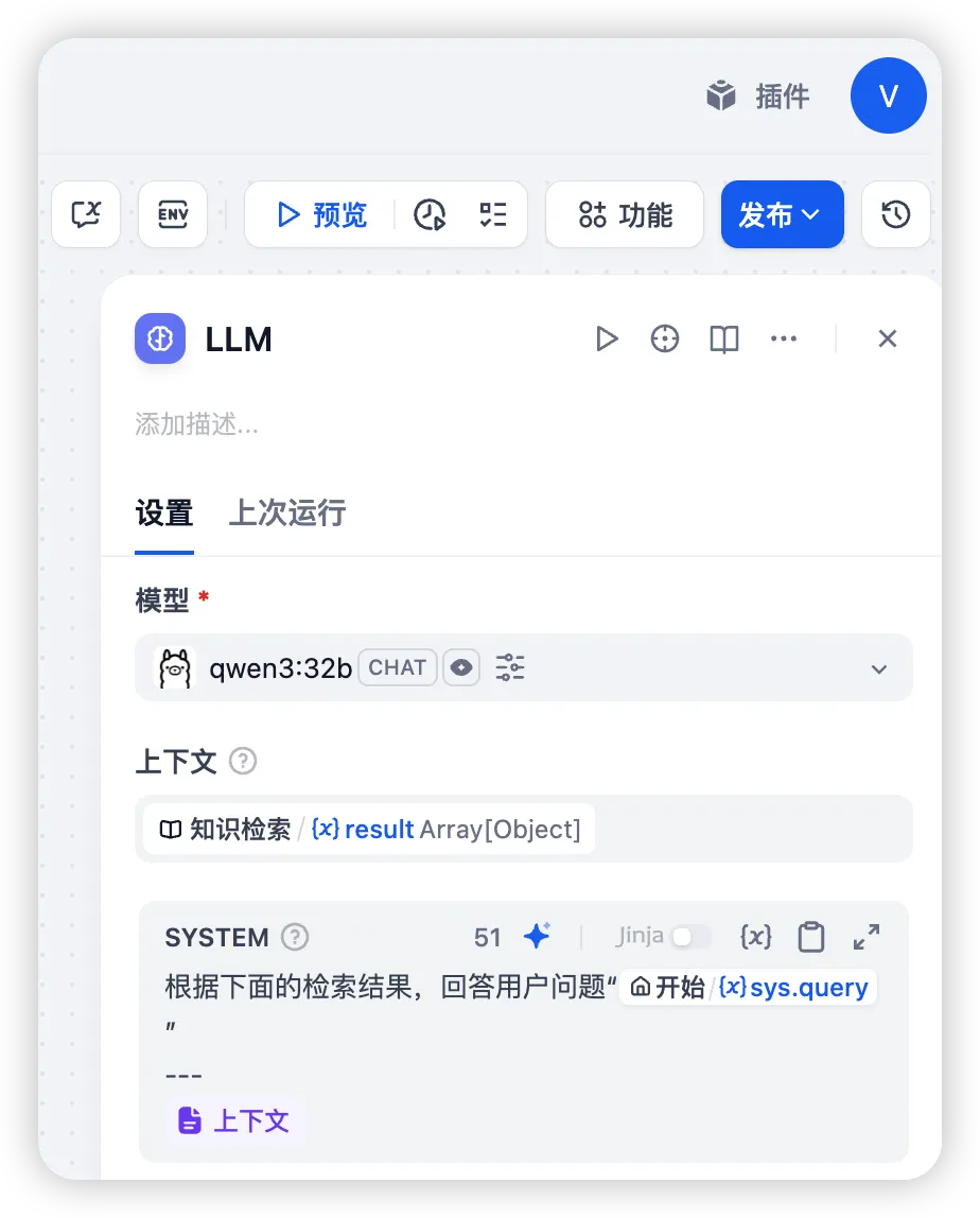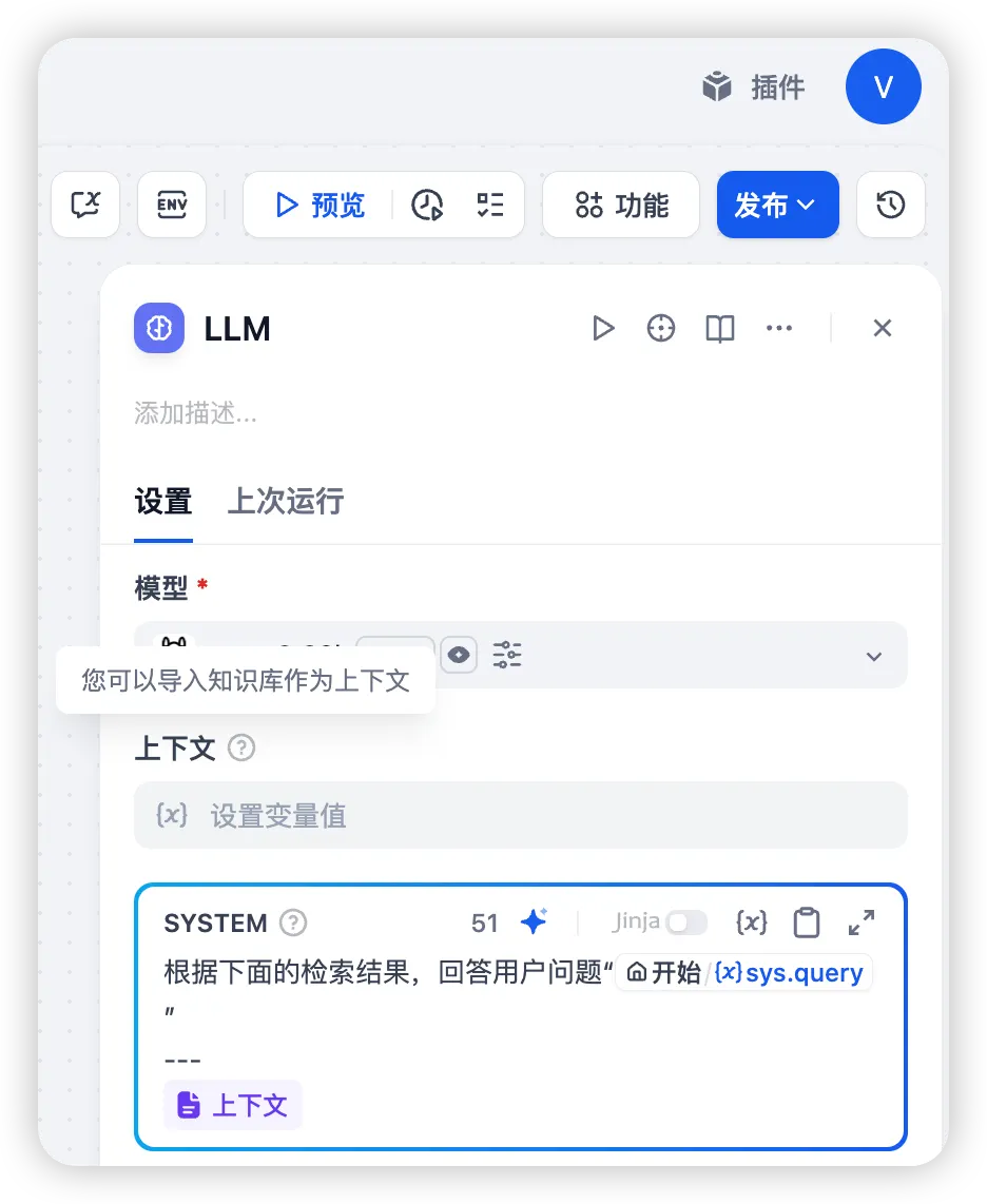 - 配置系统提示词,通过“/”增加输入变量和上下文变量