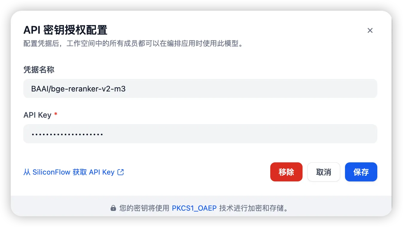 Rerank 模型目前网上有开源模型,但是 ollama 不支持 Rerank 模型的部署,这里选择硅基流动的BAAI/bge-reranker-v2-m3免费模型。