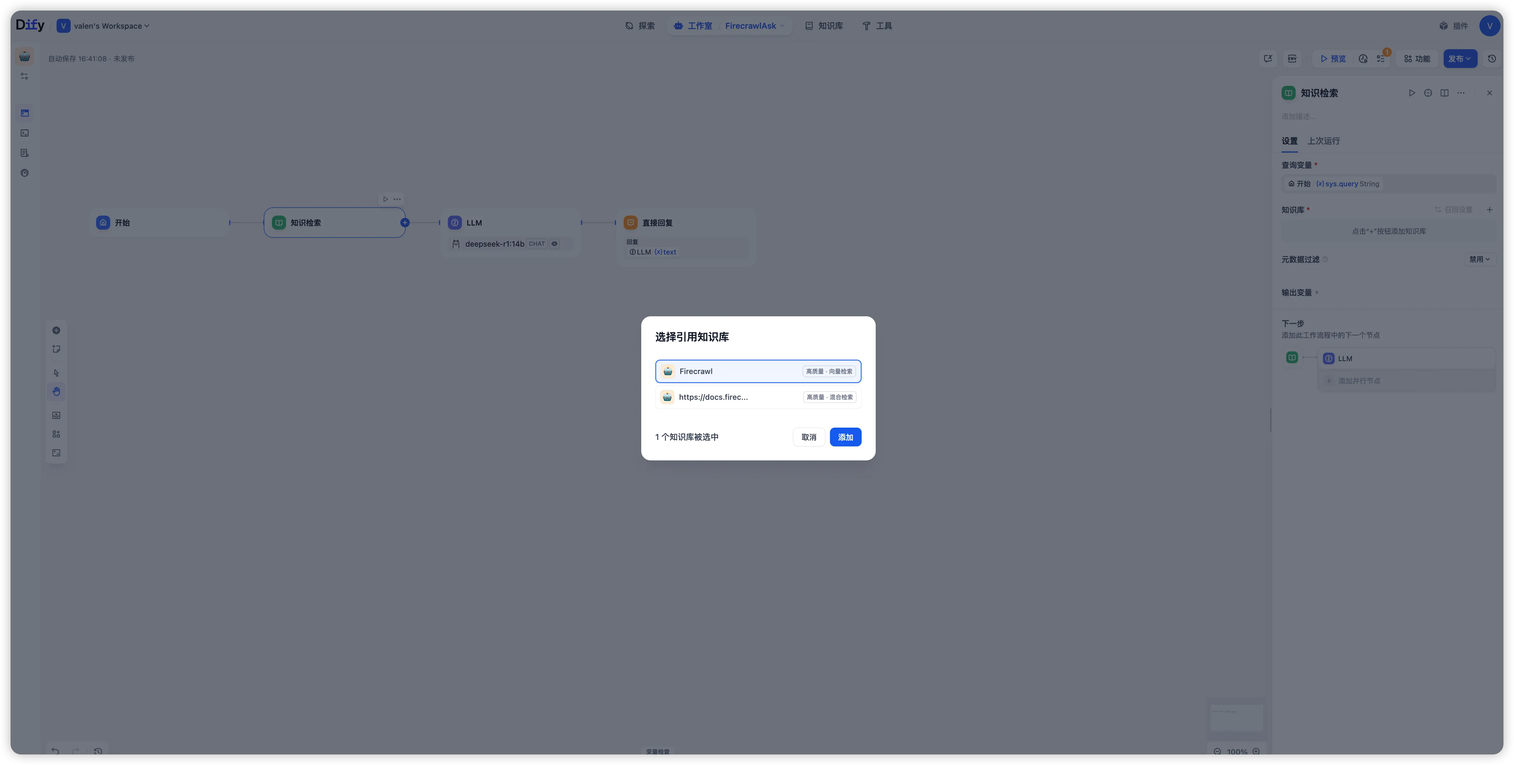 其中 Firecrawl API 密匙填写的是在安装 Firecrawl 时配置的TEST_API_KEY=ceshi。