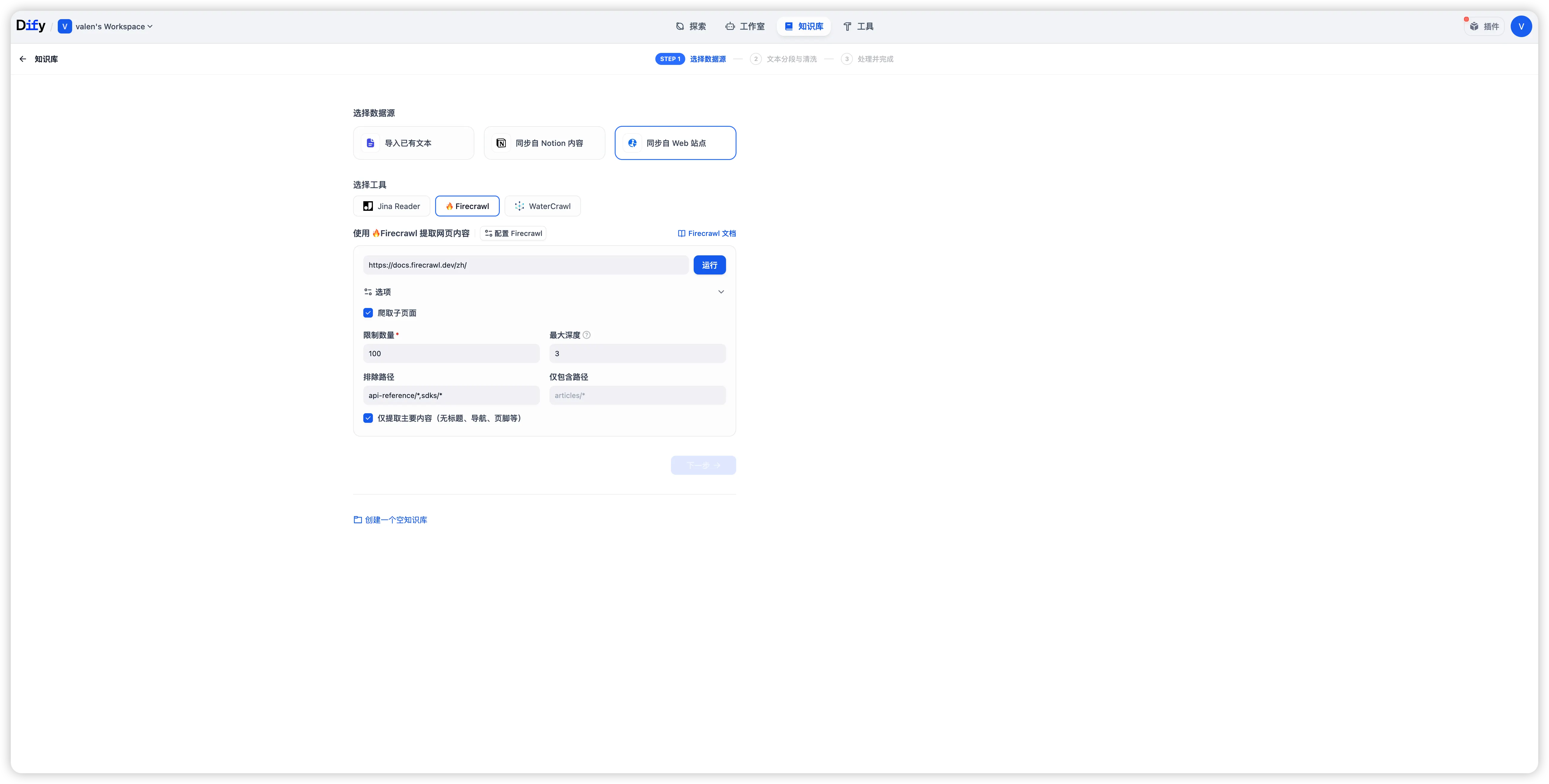 选择同步自 web 站点,选择工具-Firecrawl,爬取 Firecrawl 所有的支持文档。